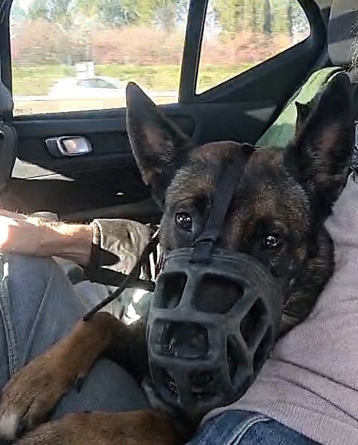 Mia n’est pas une chienne agressive : au contraire, elle est très affectueuse, sensible, accepte l’indispensable muselière sans souci, adore qu’on s’occupe d’elle. Mais son énergie est telle, son besoin de saisir, de mâcher tellement irréfragable, que seul un connaisseur peut gérer sa fougue. Elle a été entraînée par ses anciens « maîtres » à tout détruire autour d’elle, surtout ce qui est en plastique (nos seaux, arrosoirs et autres balayettes ont trouvé une mort prématurée dans son parc!) : en balade, elle se saisit des branches, des plots, de tout ce qu’elle peut croiser. Jean-Claude, éducateur canin qui heureusement est venu à la rescousse pour la prendre en main, lui apprend à se contrôler, à lâcher et elle a énormément progressé. Mais la muselière est encore indispensable pour pouvoir se promener sans qu’elle détruise sa laisse ou sans devoir rapporter un tronc ! Mais nous pouvons maintenant la sortir, ce qui était impossible avant. Avec les autres chiens, elle semble très dominante mais une entente peut s’envisager. Malheureusement, Mia a besoin d’un temps que nous n’avons pas dans un refuge. Alors elle manifeste la frustration de ce cœur trop grand pour nous en tapant le toit de sa niche, en jouant au foot avec sa gamelle, en torturant son kong (qui résiste !). Ce qui est d’autant plus dur à voir pour nous qui sommes témoins des progrès qu’elle a faits. Elle a de grandes qualités d’endurance, de ténacité, d’intelligence, qui pourraient plaire dans le milieu professionnel qui peut déceler du potentiel dans ce qui est pour nous un caractère ingérable mais nous savons aussi qu’ils sont tellement nombreux, les malinois en refuge, perles méconnues et saccagées par des acquisitions irréfléchies. Nous tenons tout de même à lancer cette bouteille à la mer. D’autant que Mia a vécu en famille, comme un autre chien, avant de tomber entre des mains malveillantes.