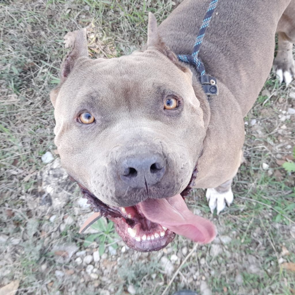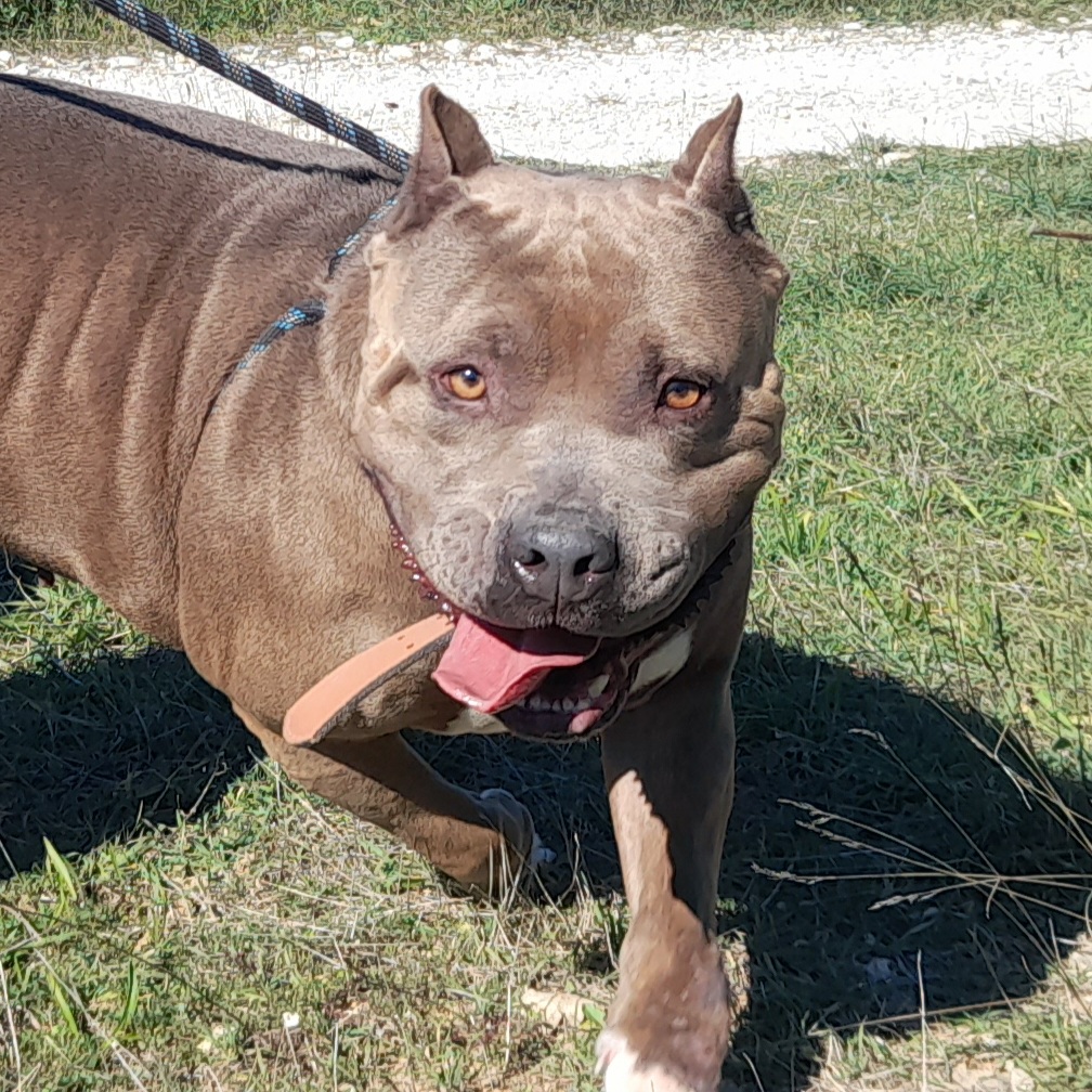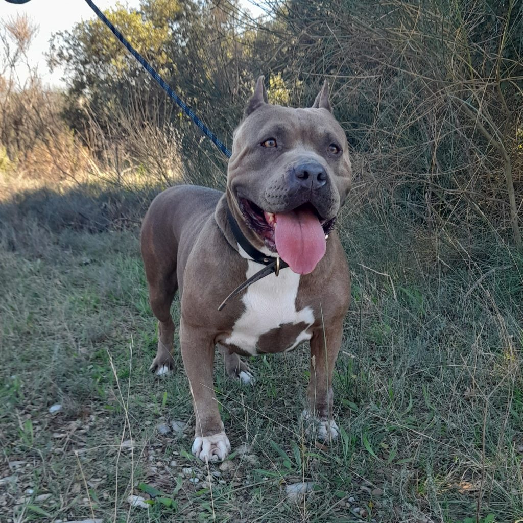 Attention ! Super tanker en approche ! Ce cube à l’air féroce est en réalité une grosse pâte de chienne, gentille comme tout, débordante d’affection. Oui, c’est une bête très puissante et brusque parfois dans ses mouvements. Pourtant, elle est calme dans son parc et n’aboie que lorsqu’elle nous voit nous éloigner d’elle. Enfin, aboie… qui n’a jamais entendu aboyer un bully risque d’être surpris ! En balade, elle tire modérément mais elle n’a surtout aucune endurance : ces chiens sont certes racés mais pas du tout faits pour l’exercice et le sport. Très vite essoufflée, elle n’aura pas besoin de grandes balades. Cependant, il faudra avoir la force suffisante pour la retenir si besoin et Mademoiselle a du muscle ! Côté entente, c’est encore flou. Les chats semblent hors de question. Pour les chiens, c’est encore un peu tôt pour se prononcer : elle ne paraît pas réactive avec ses voisins mais nous n’avons pas encore fait de test réel. Cette gentille croisée hippopotame n’a rien à faire en refuge : c’est une chienne de famille, qui aime les enfants et les gros gâtés et qui adorera mener une vie de farniente, au soleil, sur un canapé. Pearl est un bully donc n’est pas catégorisée. Comme toutes nos chiennes, elle partira stérilisée.