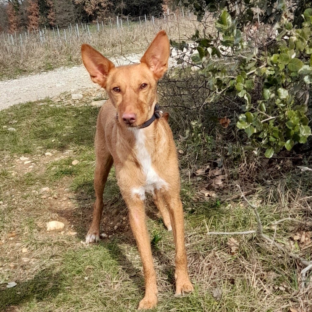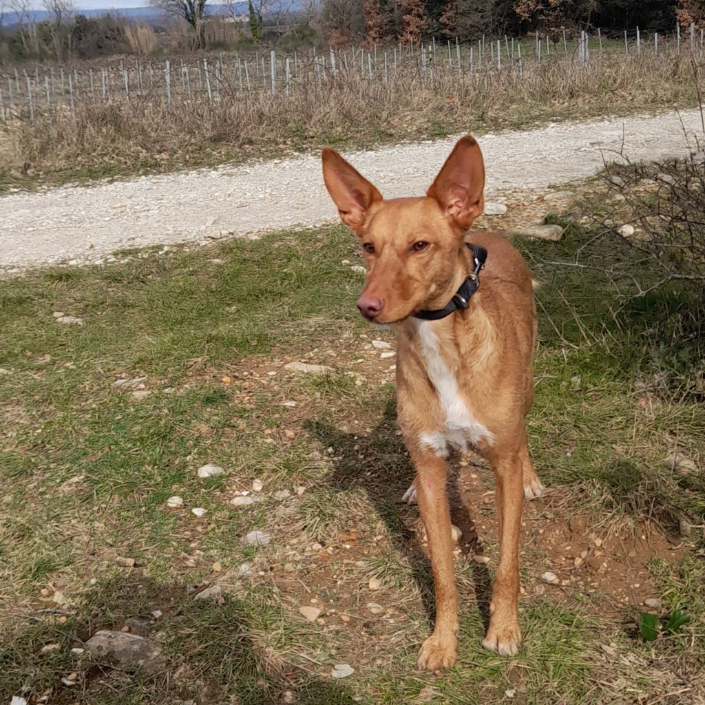 Caractéristiques : Bella a été récupérée à deux mois par des personnes âgées, certes bien intentionnées mais peu conscientes de l’énergie qu’il faut déployer lorsqu’on veut éduquer un chiot. Et de l’énergie, Bella en déborde ! C’est une adorable petite chienne. Elle n’a pas de tare : c’est juste l’incompatibilité prévisible d’une jeunette dynamique avec la vie qu’on pouvait lui proposer qui est cause de son abandon. Très vive, elle aura besoin d’apprendre à canaliser son énergie, à se poser pour devenir un chien parfait. Elle a quasi tout à acquérir mais l’essentiel est là : elle est gentille, aime beaucoup les gens (un peu trop : elle saute de façon frénétique quand elle nous voit) et recherche la compagnie. Elle pourra être un chien de famille et côtoyer des enfants sans souci, même très jeunes. Elle s’entend aussi très bien avec les chiens. La présence d’un congénère pourrait aussi faciliter son apprentissage en lui servant de modèle. Elle accepte grosso modo le chat de la maison mais chasse les autres. Côté contraintes, elle aura besoin d’apprendre à gérer la solitude (il faudra donc être présent au début et lui apprendre progressivement), à marcher en laisse sans tirer et à maîtriser les ordres de base, surtout le rappel. Il lui faudra une bonne clôture car elle peut fuguer (mais le manque de sorties, de dépense physique est dans doute en cause). C’est vraiment une gentille louloute qui a fait les frais d’une erreur de casting et a loupé les bases. Mais elle a bon fond et une fois dans un contexte rassurant et cadré, tout ira bien !