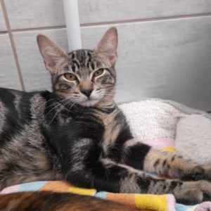 AGATE, née en 04/2025. Gentille minette peureuse, elle travaille sa socialisation.